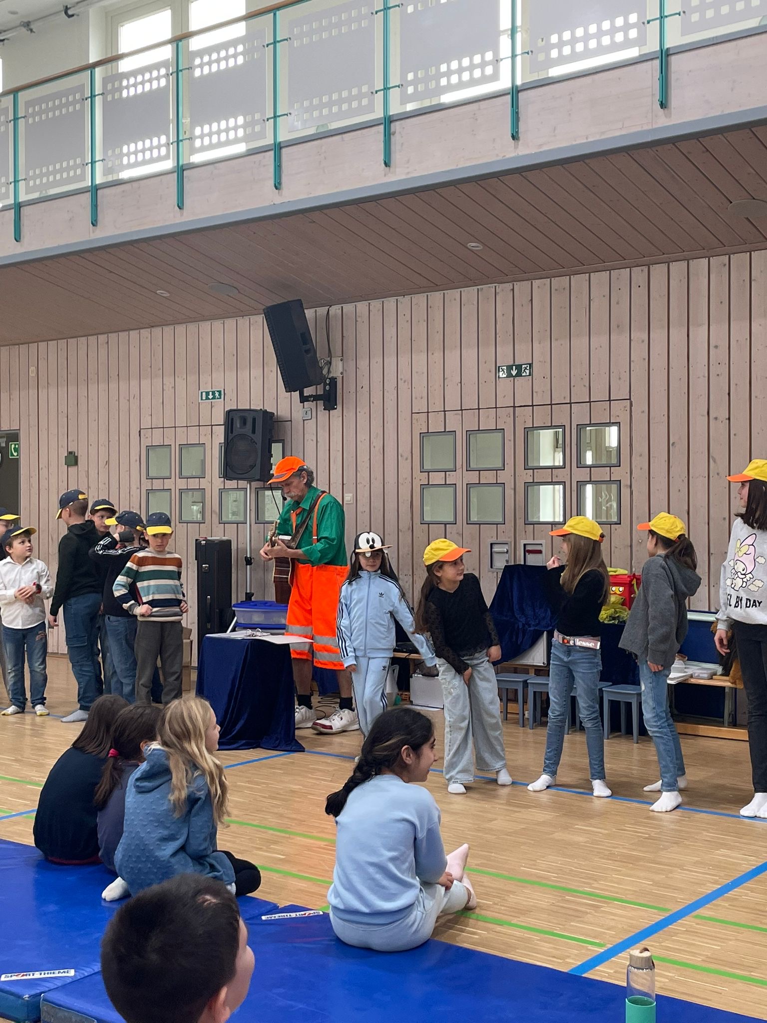 Alle Klassenstufen von eins bis drei kamen dazu in der Kapfhalle zusammen, wo sie ein abwechslungsreiches Umweltprojekt erlebten. Geleitet wurde die Aktion von Jo Brösele, der es verstand, die Kinder auf unterhaltsame und zugleich lehrreiche Weise für wichtige Umweltthemen zu sensibilisieren.