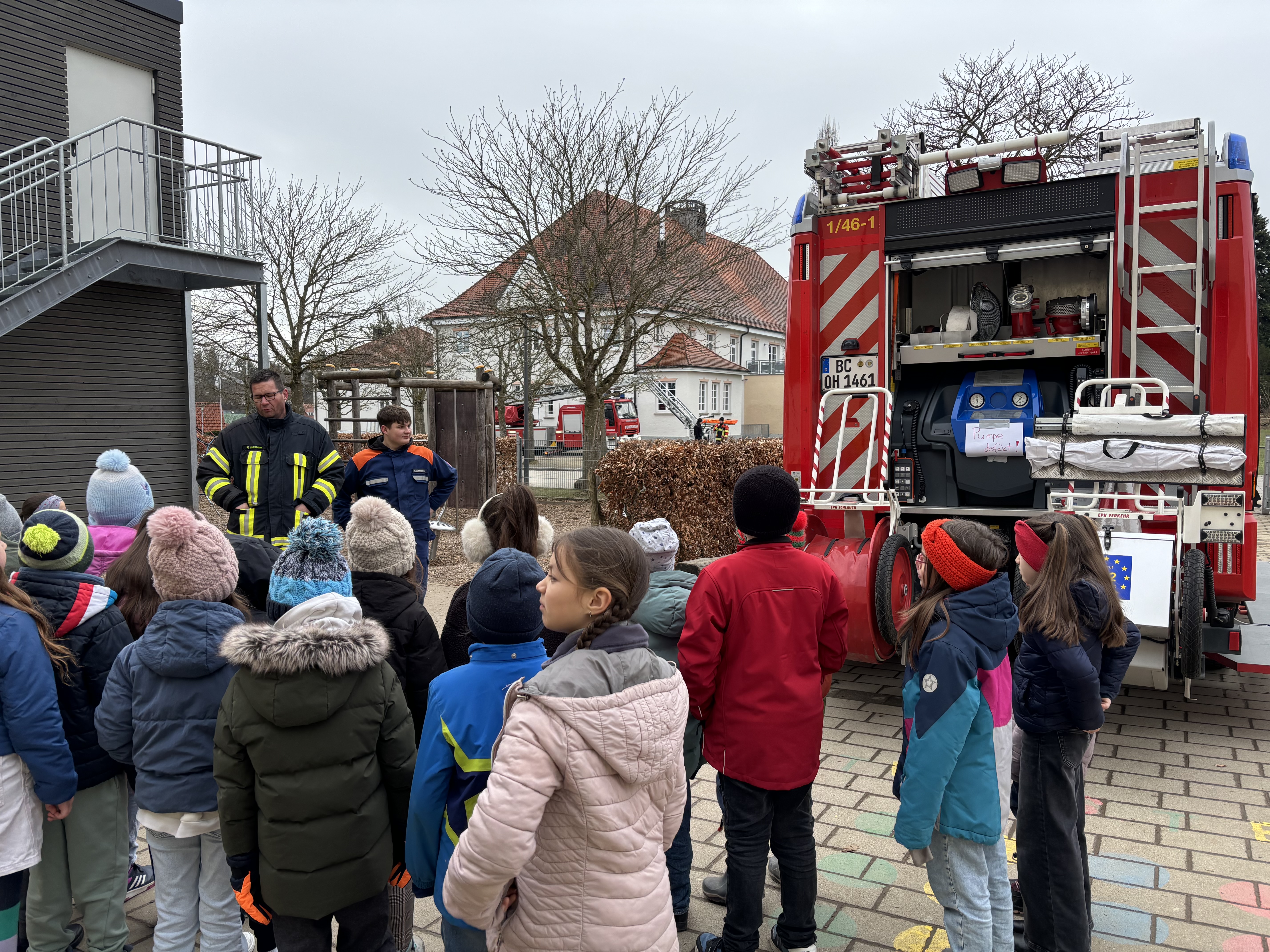 Ein Schwerpunkt lag auf der Arbeit der Feuerwehr. Die Schülerinnen und Schüler erfuhren, welche Aufgaben die Feuerwehr hat – vom Löschen von Bränden über technische Hilfeleistungen bis hin zur Rettung von Menschen und Tieren. Besonders spannend war die Vorstellung der Jugendfeuerwehr, bei der interessierte Kinder später selbst mitmachen können.